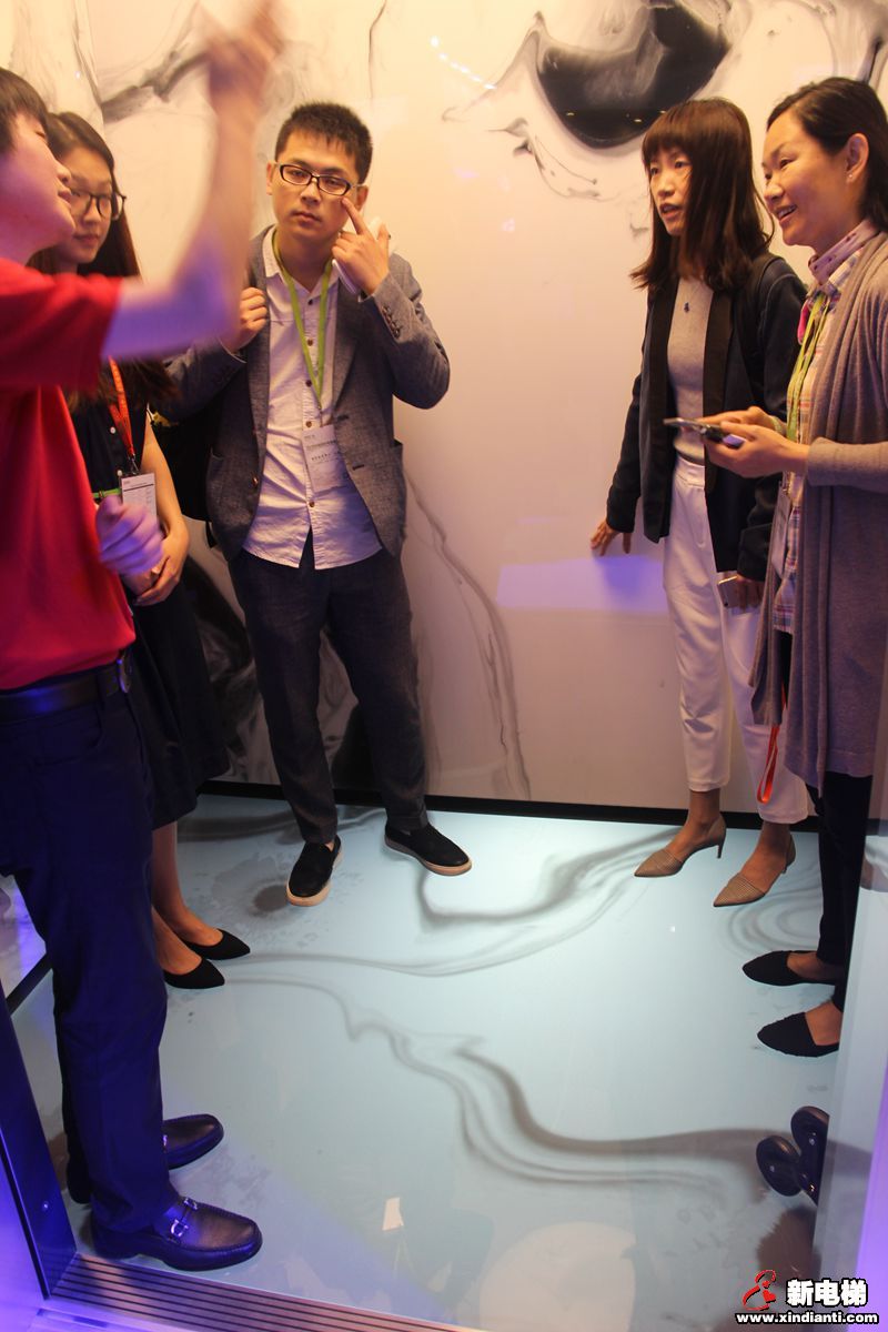 東芝幻影互動轎廂技術(shù),整體轎廂構(gòu)成一幅山水畫,乘客踩踏地面腳印即可融入中國畫的創(chuàng)作,帶給乘客奇幻的乘梯體驗(yàn)