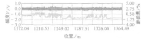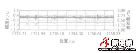 鋼絲繩檢測前應制備與受檢鋼絲繩一致的標準試樣來校準檢測儀器,并可得到儀器相應的校準曲線(圖2)。圖3是某電梯鋼絲繩斷絲檢測曲線圖,圖4是某鋼絲繩銹蝕曲線圖。通過濾波后,可以比較直觀地與標準試樣的曲線圖形進行對比分析。