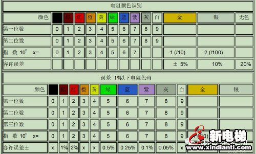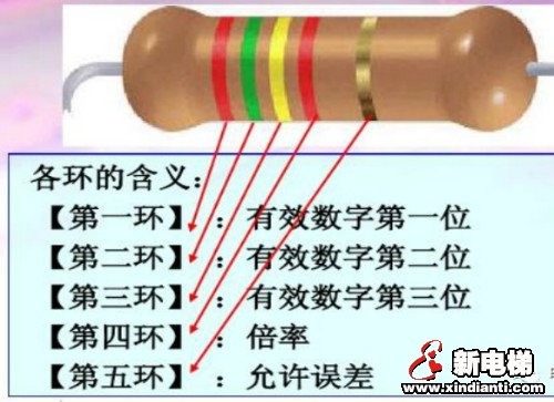 小功率的電阻器多數(shù)情況下用色環(huán)表示,特別是0.5W以下的碳膜和金屬膜電阻器較為普通。電阻器的色環(huán)可分為三環(huán)、四環(huán)、五環(huán)3種,常見的色環(huán)標(biāo)注電阻器為四、五環(huán)。含義見下圖: