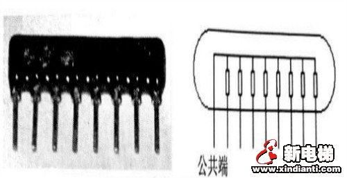 貼片排電阻、直插式排電阻及其內(nèi)部結(jié)構(gòu)圖如下: