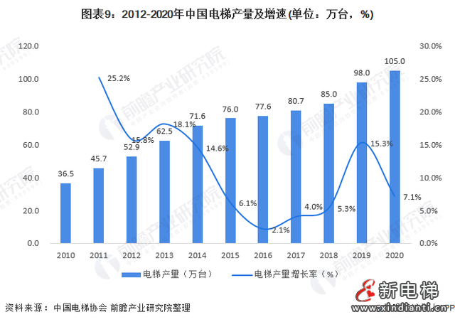 在城鎮(zhèn)化持續(xù)發(fā)展、基礎(chǔ)設(shè)施投資建設(shè)和舊樓加裝電梯等動(dòng)力推動(dòng)下,電梯行業(yè)產(chǎn)量逐漸增多。根據(jù)中國(guó)電梯協(xié)會(huì)數(shù)據(jù),2020年我國(guó)電梯產(chǎn)量達(dá)到105萬(wàn)臺(tái),增長(zhǎng)7.1%。