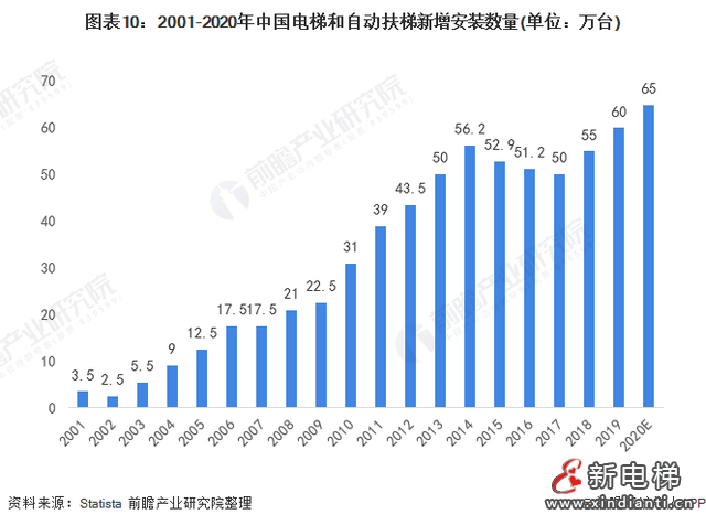 根據(jù)Statista的統(tǒng)計(jì)數(shù)據(jù)顯示,2001-2019年,中國(guó)電梯和自動(dòng)扶梯新增安裝數(shù)量呈現(xiàn)波動(dòng)上漲趨勢(shì),2019年電梯和自動(dòng)扶梯新增安裝數(shù)量為60萬(wàn)臺(tái)。結(jié)合歷史新裝數(shù)量數(shù)據(jù)及保有量新增數(shù)量初步測(cè)算,2020年中國(guó)電梯和自動(dòng)扶梯的新裝數(shù)量約為65萬(wàn)臺(tái)。