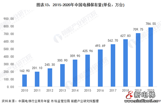 由于房地產(chǎn)、城市公共基礎(chǔ)設(shè)施建設(shè)等產(chǎn)業(yè)發(fā)展迅速,中國(guó)新裝電梯市場(chǎng)一直保持著高速增長(zhǎng),2015-2020年間,我國(guó)電梯登記數(shù)量逐年增多,2020年,我國(guó)電梯登記數(shù)量達(dá)786.55萬(wàn)臺(tái)。