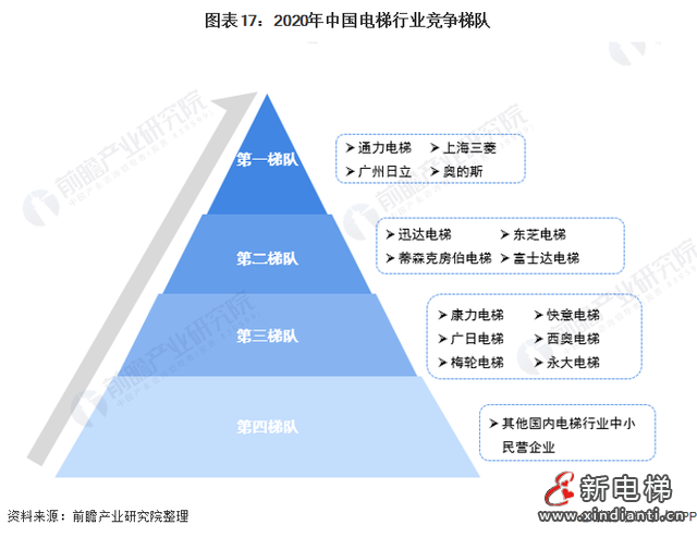 綜合各品牌在中國(guó)市場(chǎng)的研發(fā)能力、產(chǎn)品質(zhì)量、服務(wù)水平和顧客滿意度等表現(xiàn),中國(guó)電梯行業(yè)競(jìng)爭(zhēng)企業(yè)可分為四個(gè)梯隊(duì),以通力、日立以及奧的斯為代表的老牌外資電梯企業(yè)仍然領(lǐng)銜國(guó)內(nèi)電梯市場(chǎng),與上海電機(jī)的上海三菱并為第一梯隊(duì);迅達(dá)電梯、東芝電梯、蒂森電梯、富士達(dá)電梯等外資品牌的客戶管理精細(xì)程度相對(duì)較弱,位于第二梯隊(duì);永大電梯、康力電梯、西奧電梯等本土電梯企業(yè)產(chǎn)品成為民族品牌電梯代表,發(fā)展勢(shì)頭強(qiáng)勁,位于第三梯隊(duì);其他國(guó)內(nèi)電梯行業(yè)的中小企業(yè)位于第四梯隊(duì)。