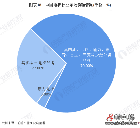 根據(jù)同力日升公司于2021年發(fā)布的招股說(shuō)明書(shū)中數(shù)據(jù)顯示,我國(guó)電梯行業(yè)市場(chǎng)集中度較高,奧的斯、迅達(dá)、通力、蒂森、日立、三菱等少數(shù)外資品牌占據(jù)了國(guó)內(nèi)市場(chǎng)約70%的份額。本土電梯品牌的市場(chǎng)占有率約30%。在國(guó)產(chǎn)本土品牌中,康力電梯整梯業(yè)務(wù)占比超80%,2020年電梯銷量近3萬(wàn)臺(tái),國(guó)內(nèi)市占率約3%。