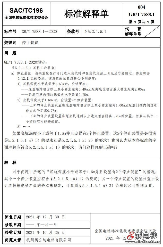 關(guān)于發(fā)布GB/T 7588.1—2020《電梯制造與安裝安全規(guī)范  第1部分:乘客電梯和載貨電梯》第3至5號(hào)解釋單的通知